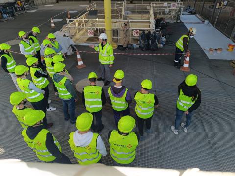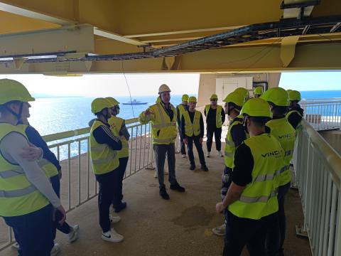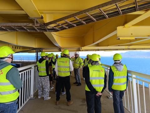 Στη συνέχεια, λαμβάνοντας τα απαραίτητα μέτρα ασφαλείας, οι φοιτητές μας ξεναγήθηκαν στην γέφυρα και ειδικά σε έναν από τους πυλώνες της από τον κ. Λούκα, όπου δόθηκε ιδιαίτερη σημασία στα στοιχεία της μεταλλικής κατασκευής του έργου. Ο κ. Λούκας απάντησε σε πλήθος ερωτήσεων των φοιτητών μας.